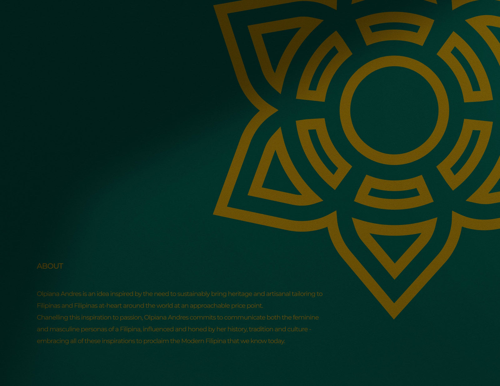 To redefine, reshape and uplift the Philippine Fashion by striking balance between Olpiana Andres' ethos and our Filipino Culture infused in our Bespoke and Made-to-Order pieces
